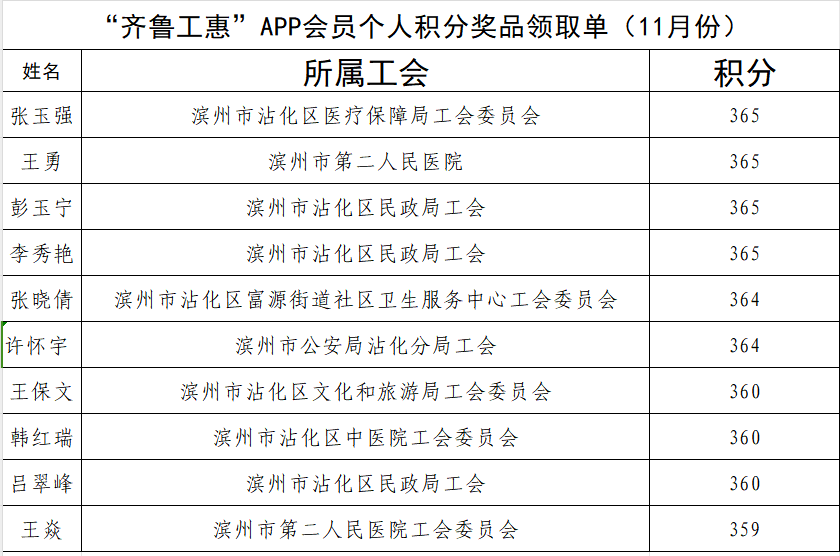 自《关于“齐鲁工惠”APP会员个人积分截图报送的通知》下发以来,区总工会共收到156个工会组织的1000余份积分截图。现已将11月份会员个人积分进行排名,快看看中奖名单里有你吗.......