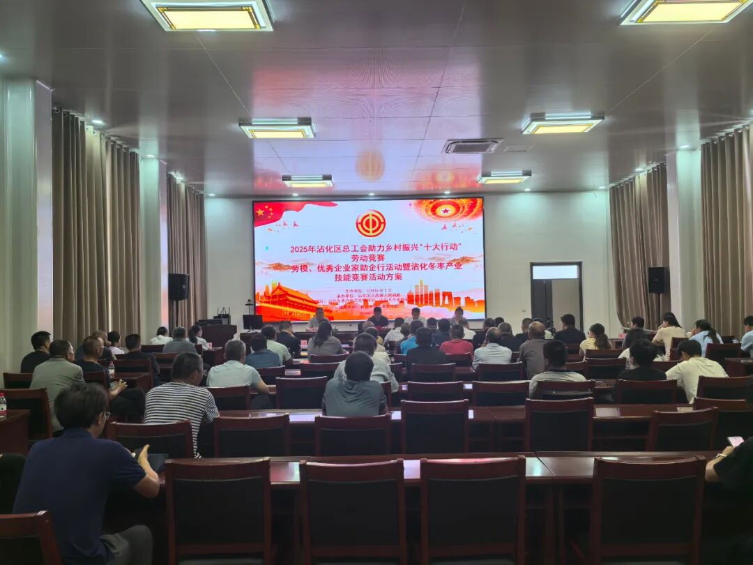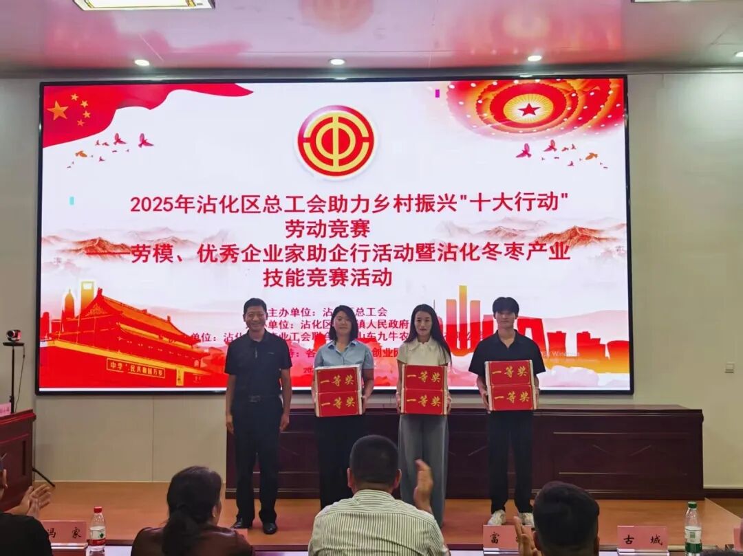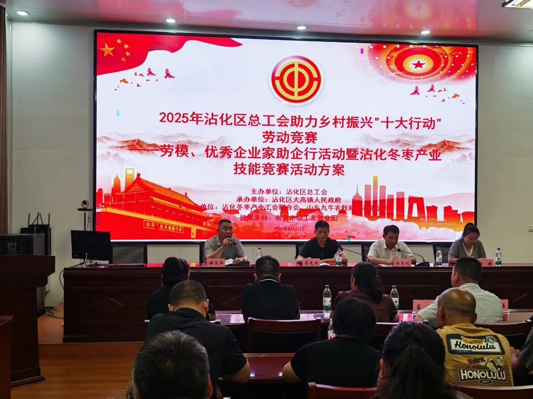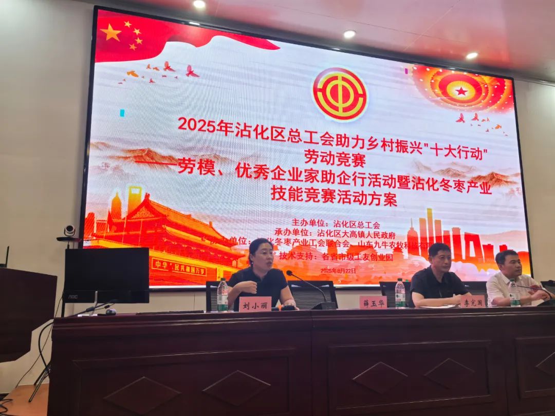 为深入贯彻落实乡村振兴战略,充分发挥劳模和优秀企业家的示范引领作用,8月22日下午,2025年沾化区总工会助力乡村振兴"十大行动"劳动竞赛——劳模、优秀企业家助企行活动暨沾化冬枣产业技能竞赛在山东九牛农牧科技有限公司成功举办。