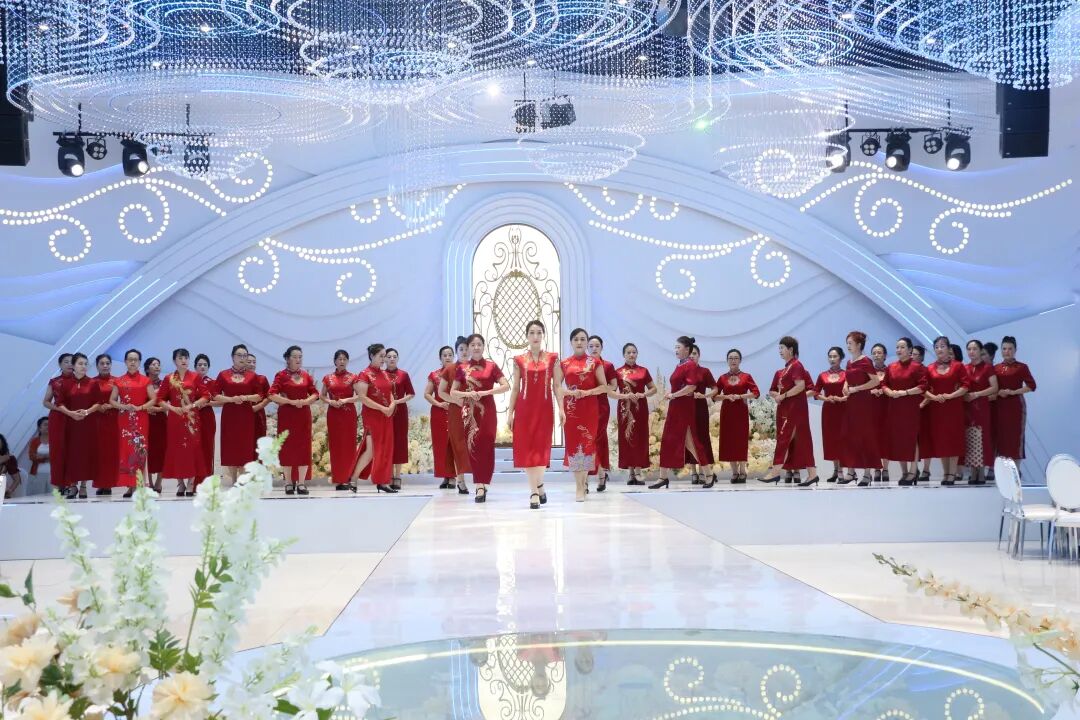 红纱斗笠旗袍秀《盛夏令》带来强烈的视觉冲击。红纱飘逸灵动,斗笠遮面神秘莫测,模特们迈着灵动的步伐,将夏日的热烈与旗袍的风情完美结合,宛如一幅绚丽多彩的夏日画卷,惊艳全场。