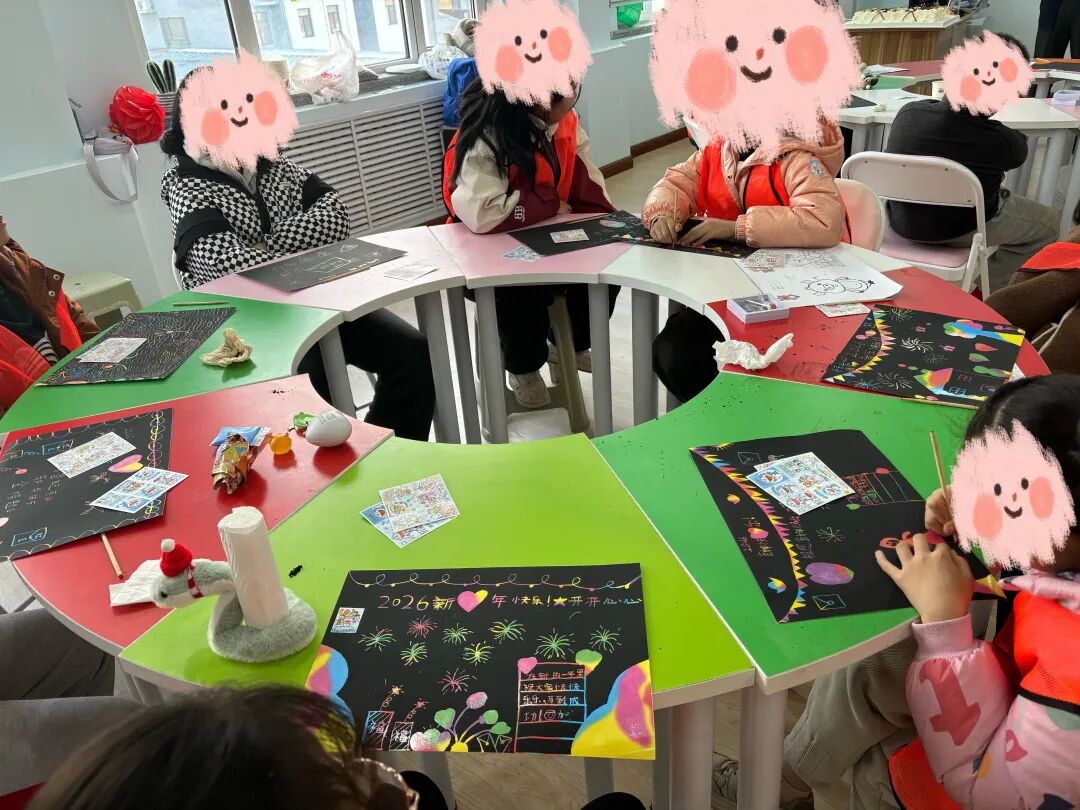 刮画寄心愿,童趣迎新年。一块块漆黑的画板,成了孩子们迎接新年的魔法天地,孩子们凝神专注,用灵巧的双手刻画下“新年快乐”的美好字样,勾勒出对未来的憧憬与期盼。这场互助式绘画,既让孩子们体验了动手创作的快乐,更让新年的祝福多了一份专属的童趣与温暖。