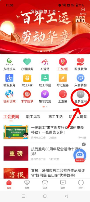 1、打开“齐鲁工惠”app,顶端切换至“滨州市总工会”,在首页中找到“更多应用”,点击进入。