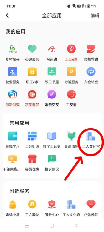 2、进入后页面顶端显示“全部应用”,在“常用应用”中找到“工人文化宫”,点击进入。