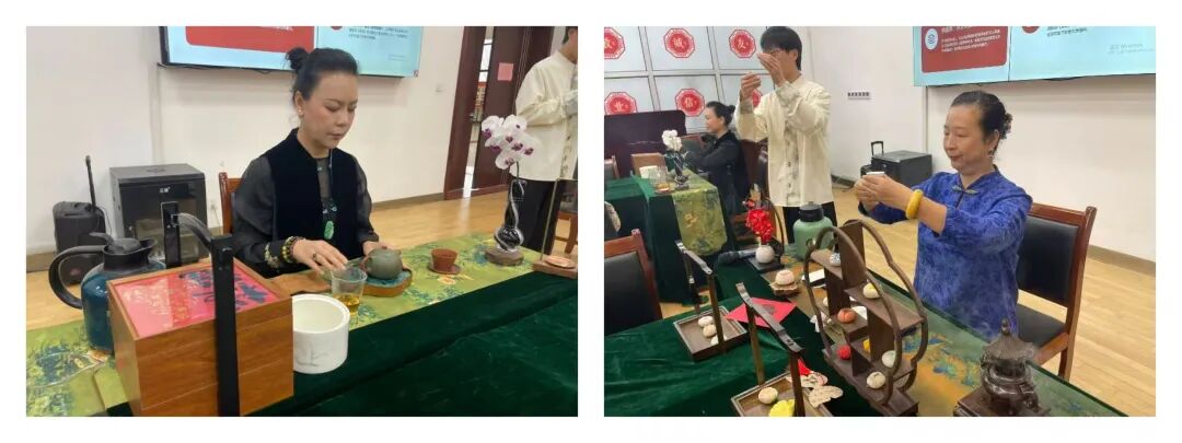 茶会现场,任老师带领大家走进中华茶文化的雅致世界,以生动易懂的语言,讲解茶的起源、品类、冲泡技法与茶道礼仪。两位茶艺师现场演绎,从温杯、投茶、注水、出汤到奉茶,每一个动作行云流水、端庄优雅,让大家直观感受传统茶艺的仪式感与美感。